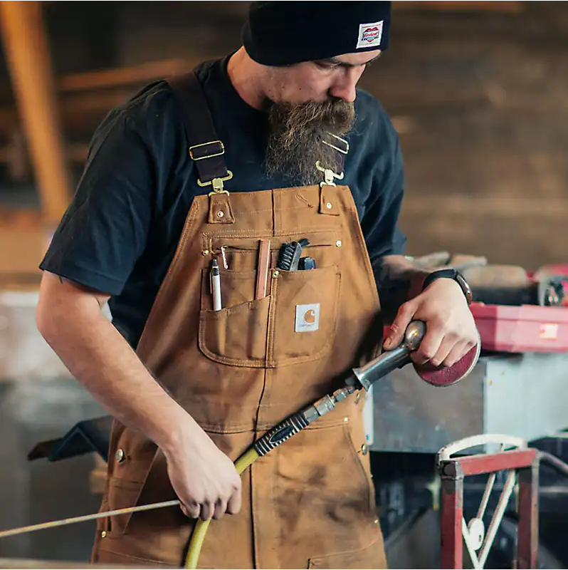 An update to our most popular unlined bib, the R01, these heavyweight men's bib overalls were designed using feedback from our Carhartt Crew. Every detail, from the front-to-back kick panel on the cuffs to the extra stretch around the waist, was informed by the hardworking people who wear our gear day-in and day-out. The heavyweight cotton duck material makes them dependable and durable. Elastic suspenders, a double layer at the knees, and ample pockets provide even more durability and functionality. Compatible with the Carhartt Knee Pad.